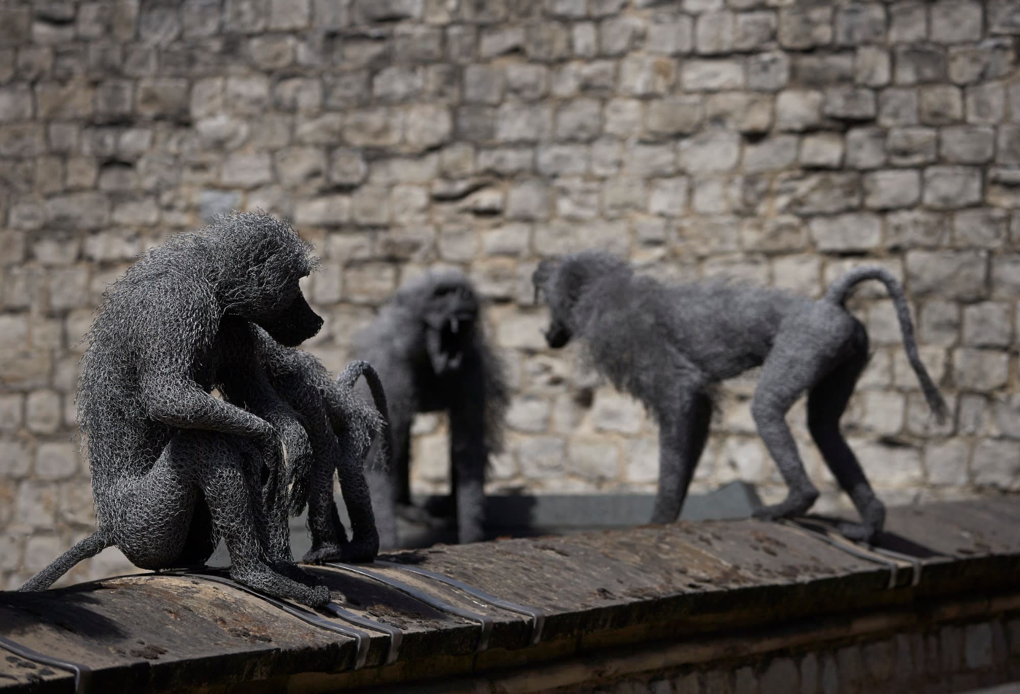 A troop of Hamadryas baboons command the wall in front of the Jewel House at the Tower. The baboons, playful, humerous and fierce were particularly popular with visitors.